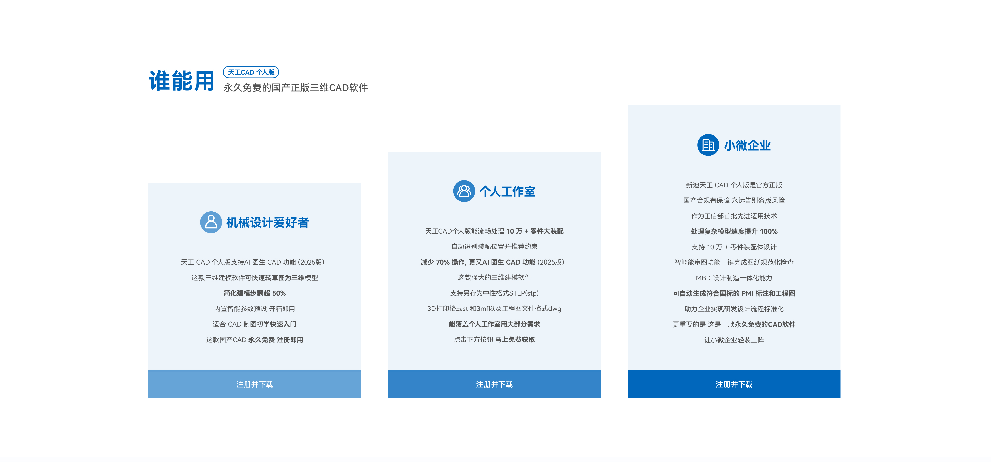 天工CAD个人版能够满足个人用户绝大部分使用场景,是一款成熟稳定,功能强大,全面兼容的免费国产制图软件