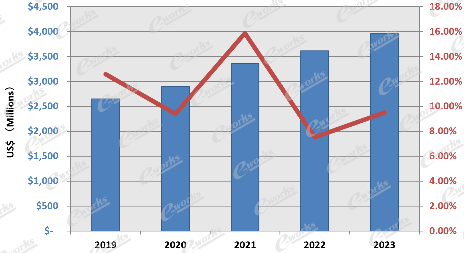2023年,中国PLM市场维持个位数增速,市场容量扩大至39.55亿美元,较2022年36.12亿美元增长9.5%。2023年全球PLM市场增长8.6%,达到724亿美元,略低于去年增长10.1%的预期,中国PLM市场占全球份额为5.46%。图 1显示了2018至2023年中国PLM市场的增长趋势。