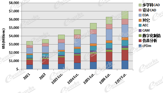 图2显示了2021年至2027年中国PLM各个细分市场的发展历程与预测。