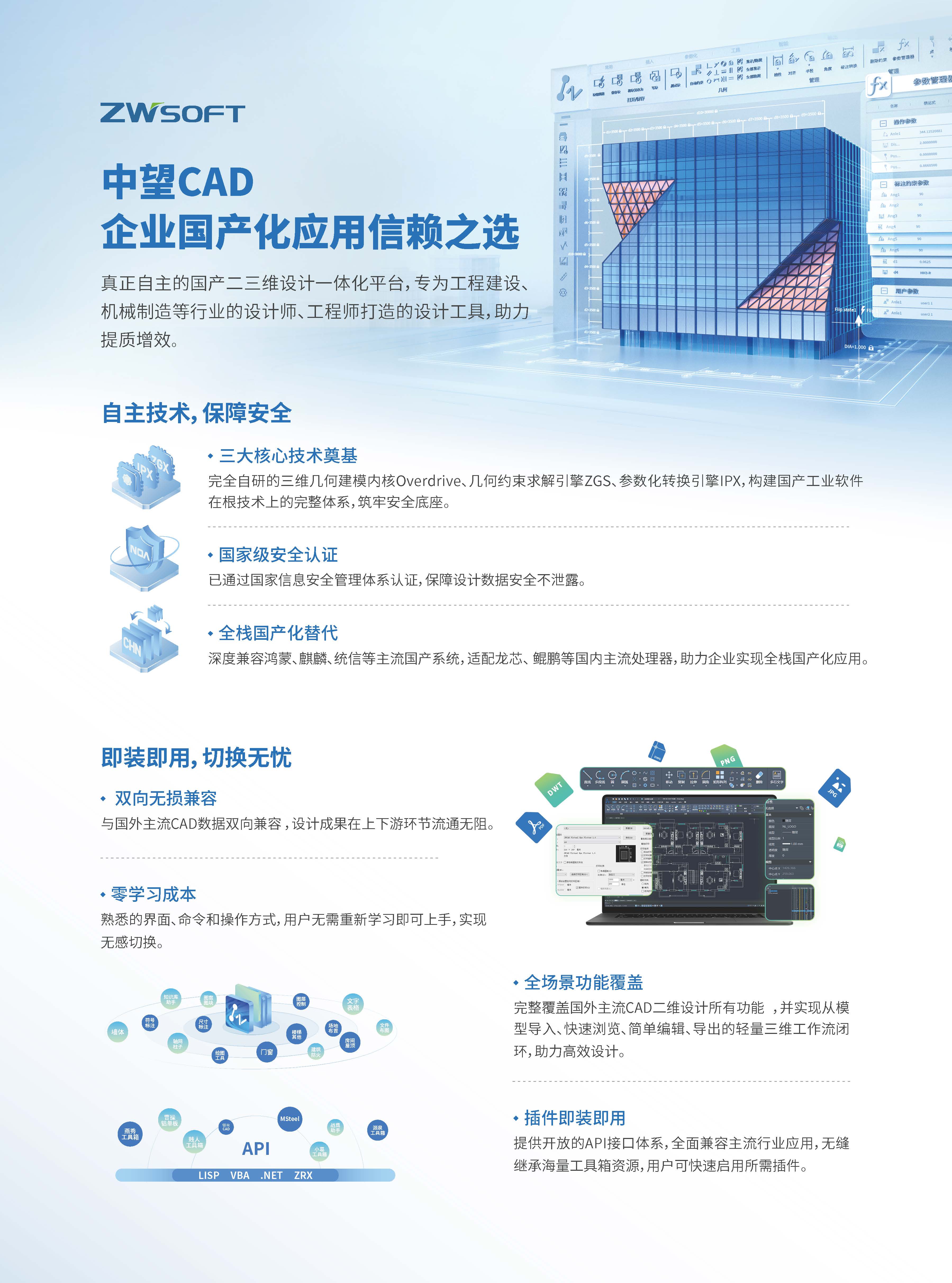 中望CAD平台软件V2026是基于自主内核的国产CAD平台。完美兼容DWG格式,采用先进技术手段,实现高效绘图体验,同时支持主流行业应用和用户个性化功能定制开发。广泛应用于建筑、勘察、市政规划、机械制造等行业,助力企业提质增效。