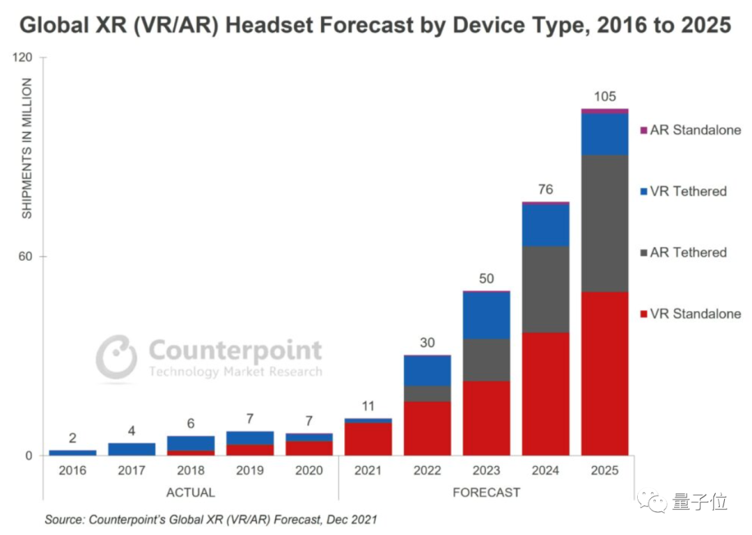 此外据 Counterpoint 预测,今年 AR / VR 头显的销量将会显著增加,到 2025 年出货数量将增加到 1.05 亿台,是 2021 年出货量的 10 倍。