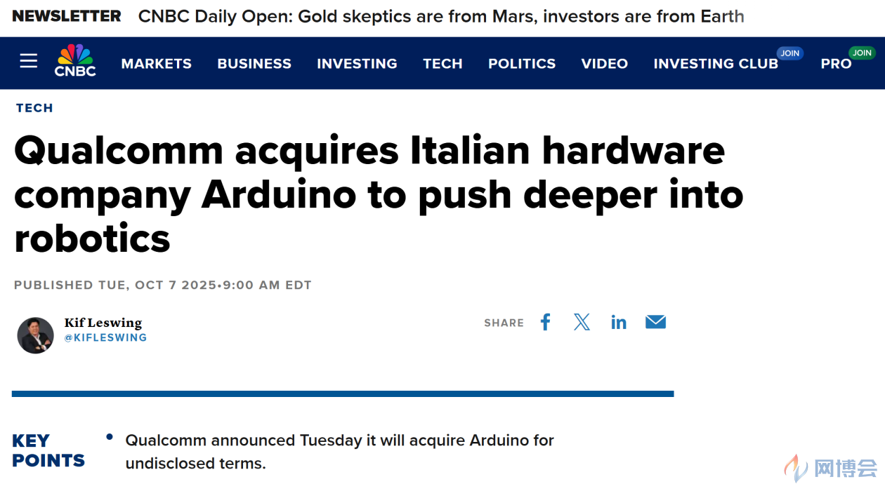 当地时间10月7日,高通公司宣布收购意大利开源硬件与软件企业Arduino,此举旨在进一步深耕机器人与物联网开发生态,加速推进其在边缘计算及人工智能(AI)领域的开发者战略布局,为相关产业创新发展注入新动能。