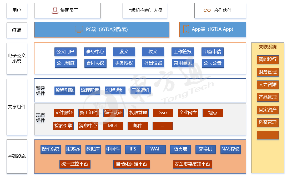 电子公文系统采用安全创新软硬件进行搭建部署,接入国泰君安标准监控体系,提供浏览器访问及通过App访问两种使用方式,便于目标用户便捷查阅及审批公文,总体架构如下图: