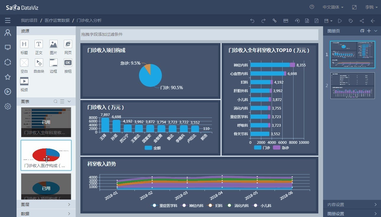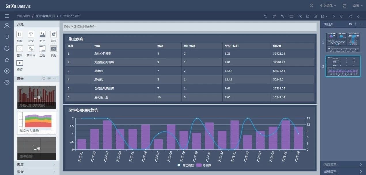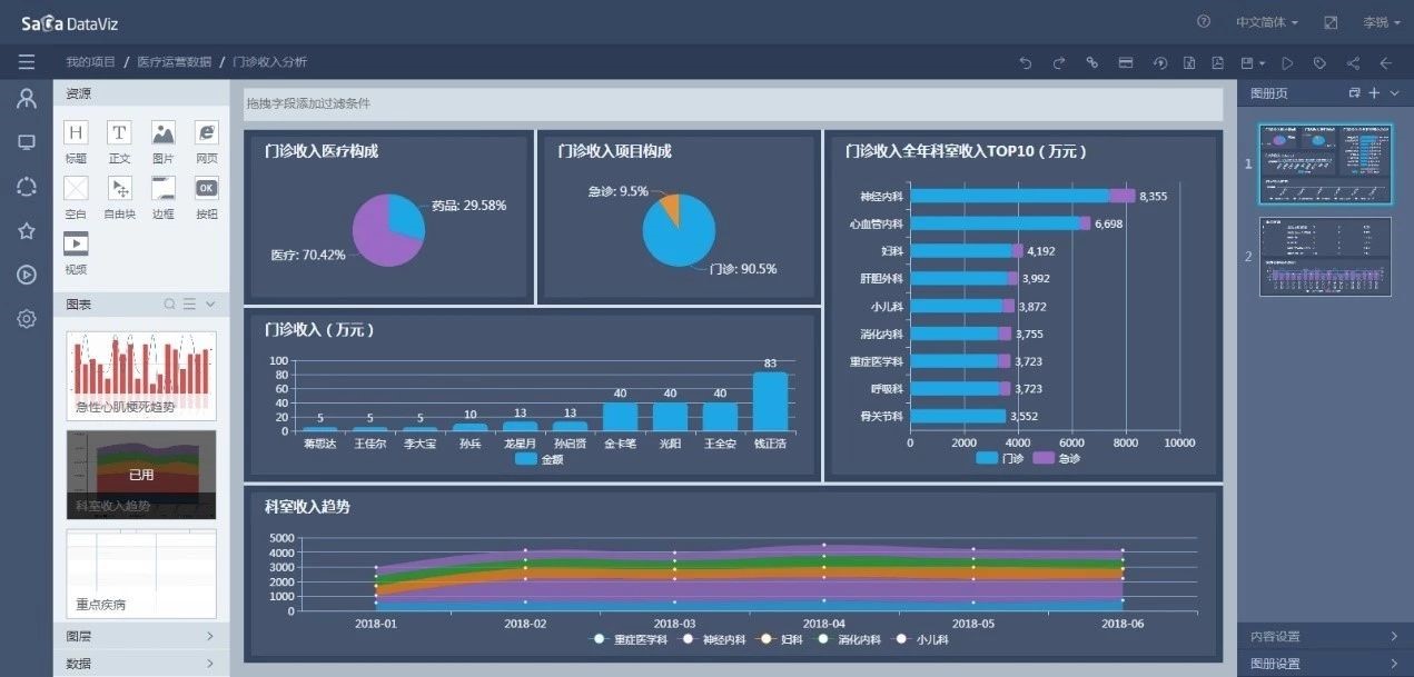 医院运营分析主要包括临床业务分析、效率分析、收入分析、疾病分析、收入分析等多个主题,利用 SaCa DataViz 通过对历史数据的深入挖掘,快速获取各主题分析结果,快速了解医院各方面运营状况。