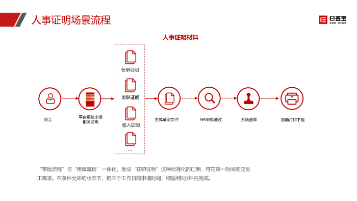 例如,各地员工申请开具在职证明、收入证明等各类人事证明文件时,过去采用线上审批+线下盖章分开进行的方式,有时还会涉及到分、子公司与总部之间的签章往来,周期长、效率低。