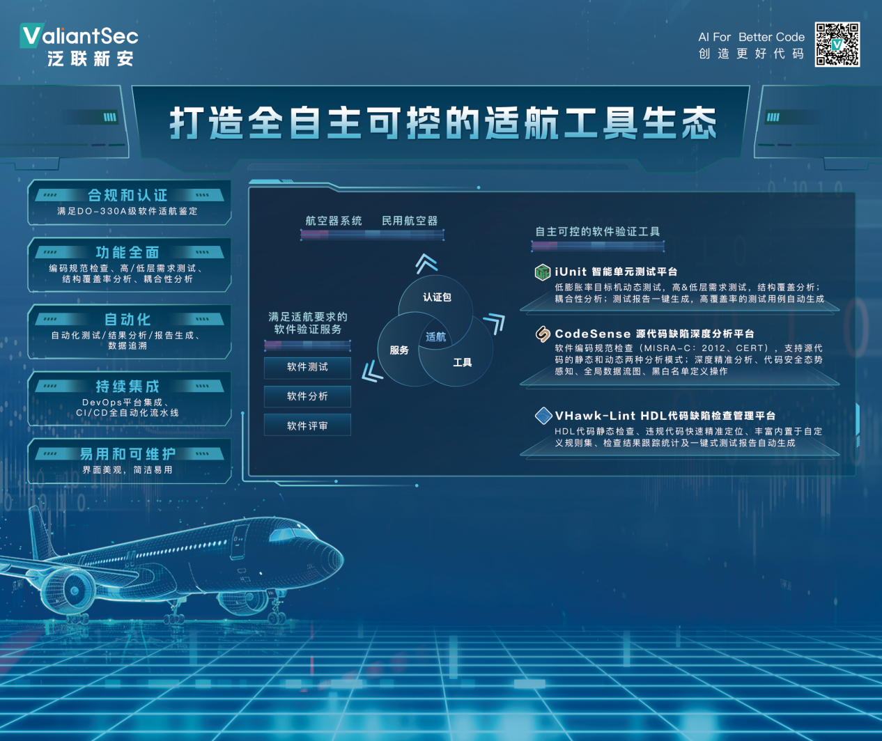 作为受邀企业,泛联新安多年来致力于突破关键技术瓶颈,目前已为多家航空领域关键部门提供技术支撑,本次论坛特别携iUnit智能单元测试平台、CodeSense源代码缺陷深度分析平台、VHawk-LintHDL代码缺陷检查管理平台等多款适航工具产品亮相,与行业伙伴积极展开深入交流,致力于打造全自主可控的适航工具生态。