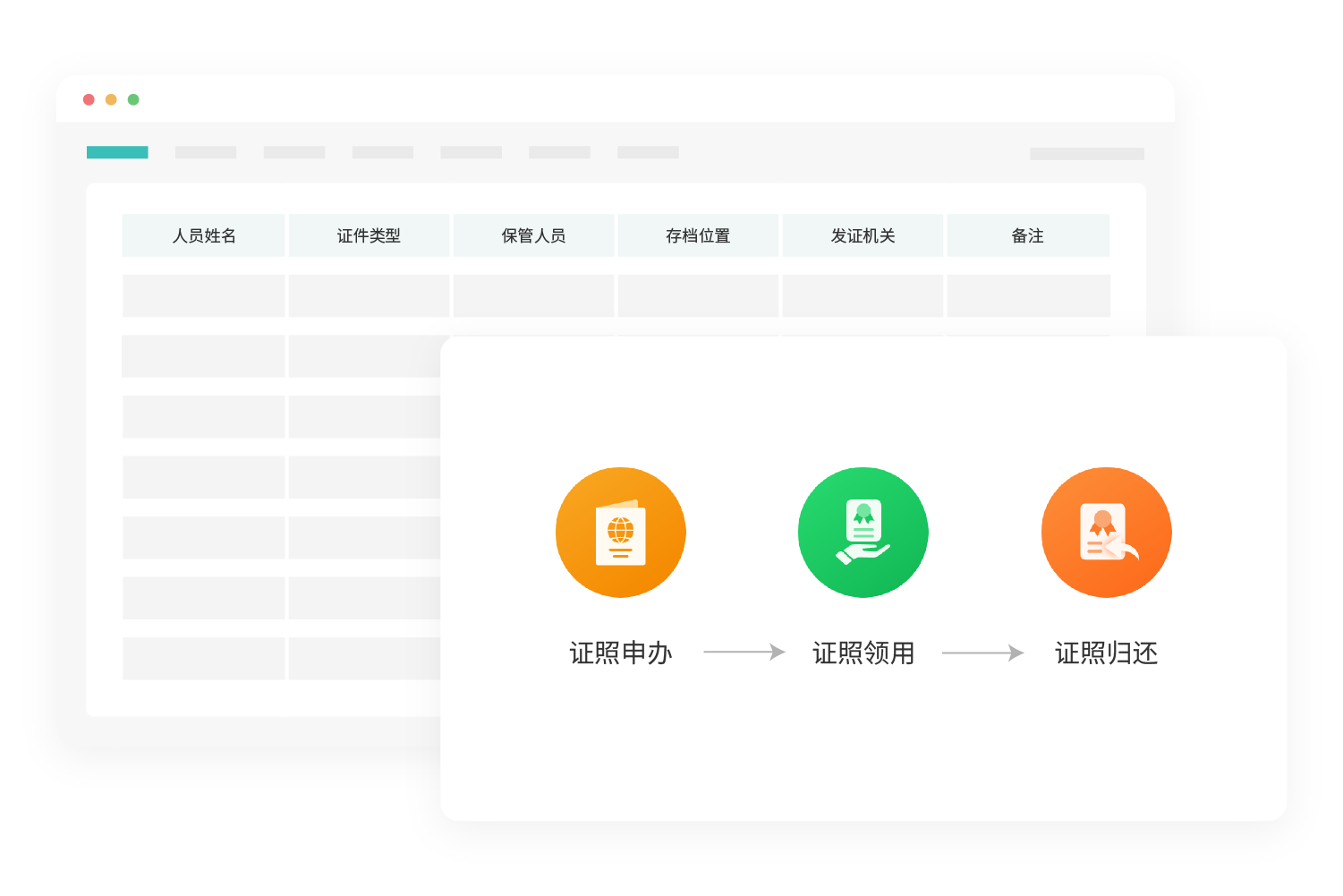 针对重点岗位、核心人员的护照等相关证件进行规范化统一管理,规范使用,各类证照状态、流向清晰,利于风险管控