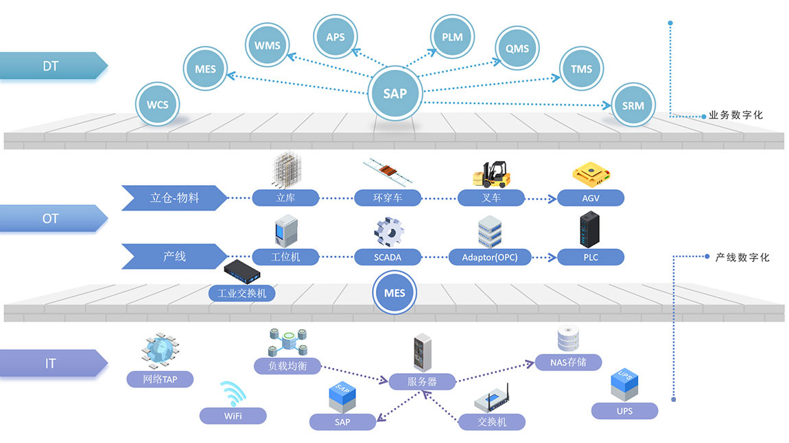 2.OT设备如立仓、立库、AGV、sacada、工位机等需要与IT系统无缝对接,以实现数据的实时传输和设备的智能控制;