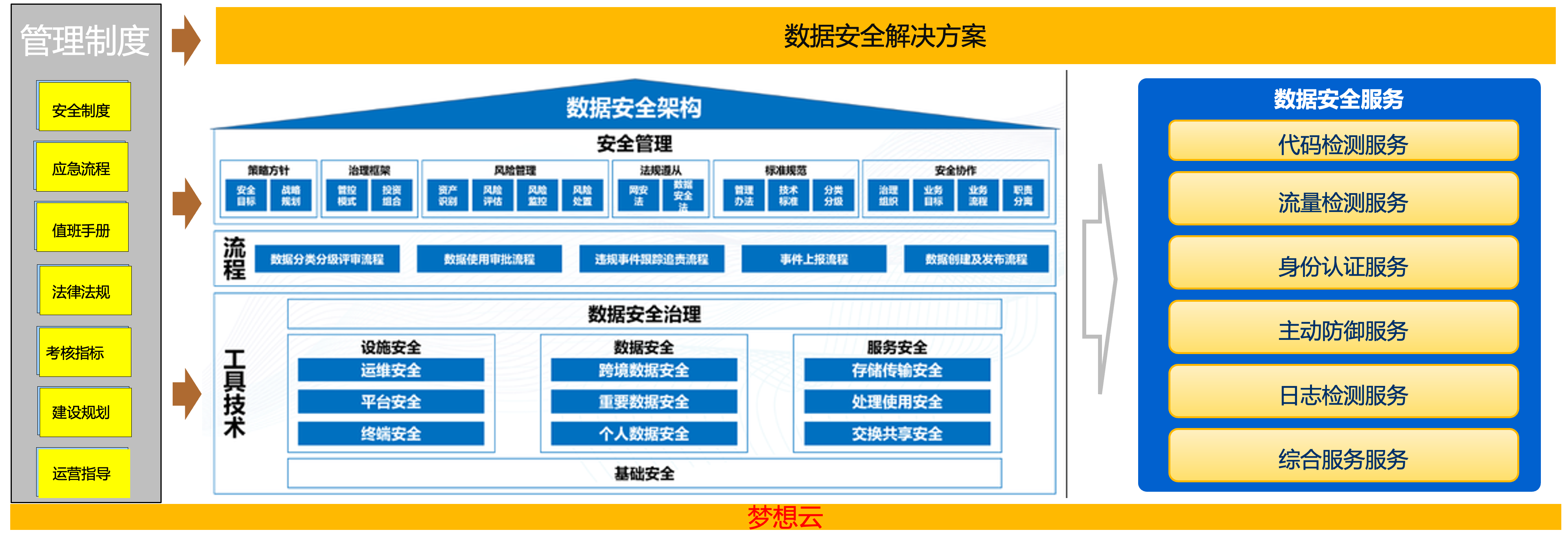 数据安全解决方案包含代码检测、流量检测、身份认证、主动防御、日志检测和综合服务等六个三级产品线系列相关产品,形成一个综合性的策略型数据安全解决方案。