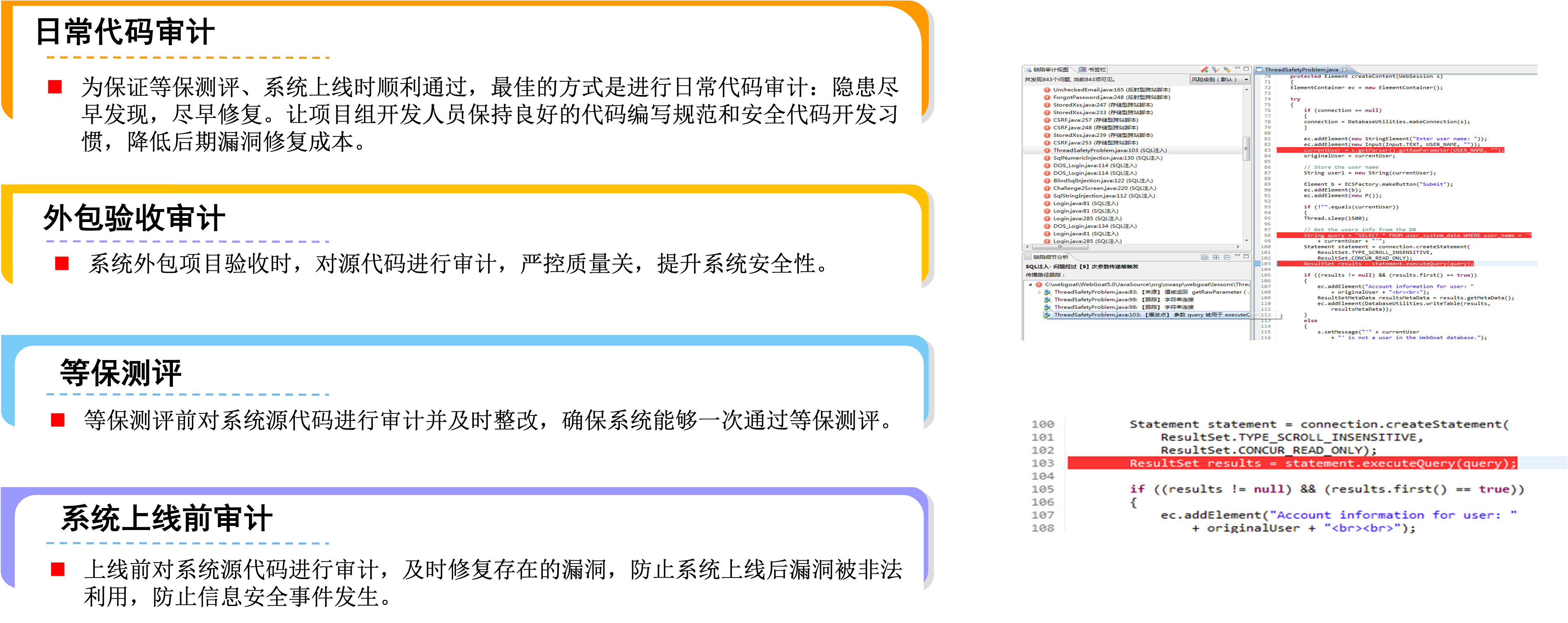 代码安全检测服务是一种对静态的代码进行分析,通过白盒测试的方式发现代码中存在的代码编写隐患。这种方式可以更早、更全面、更彻底的,在软件发布之前发现存在的安全隐患。