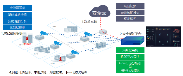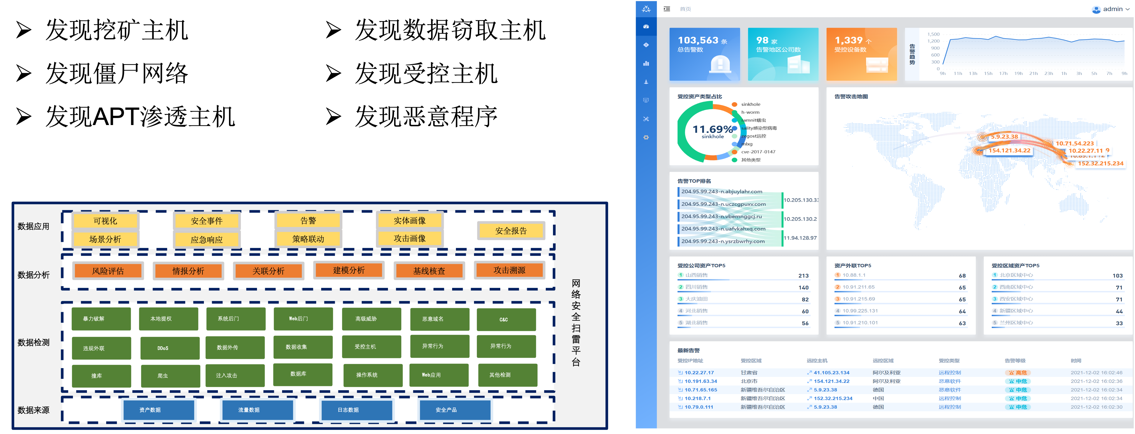 网络安全扫雷服务是基于网络流量快速判定网络中已被攻击的主机,在攻击事件产生恶劣影响之前及时感知已失陷的IT资产,提升安全响应效率,加强集团公司安全防护能力,完善安全防护体系。