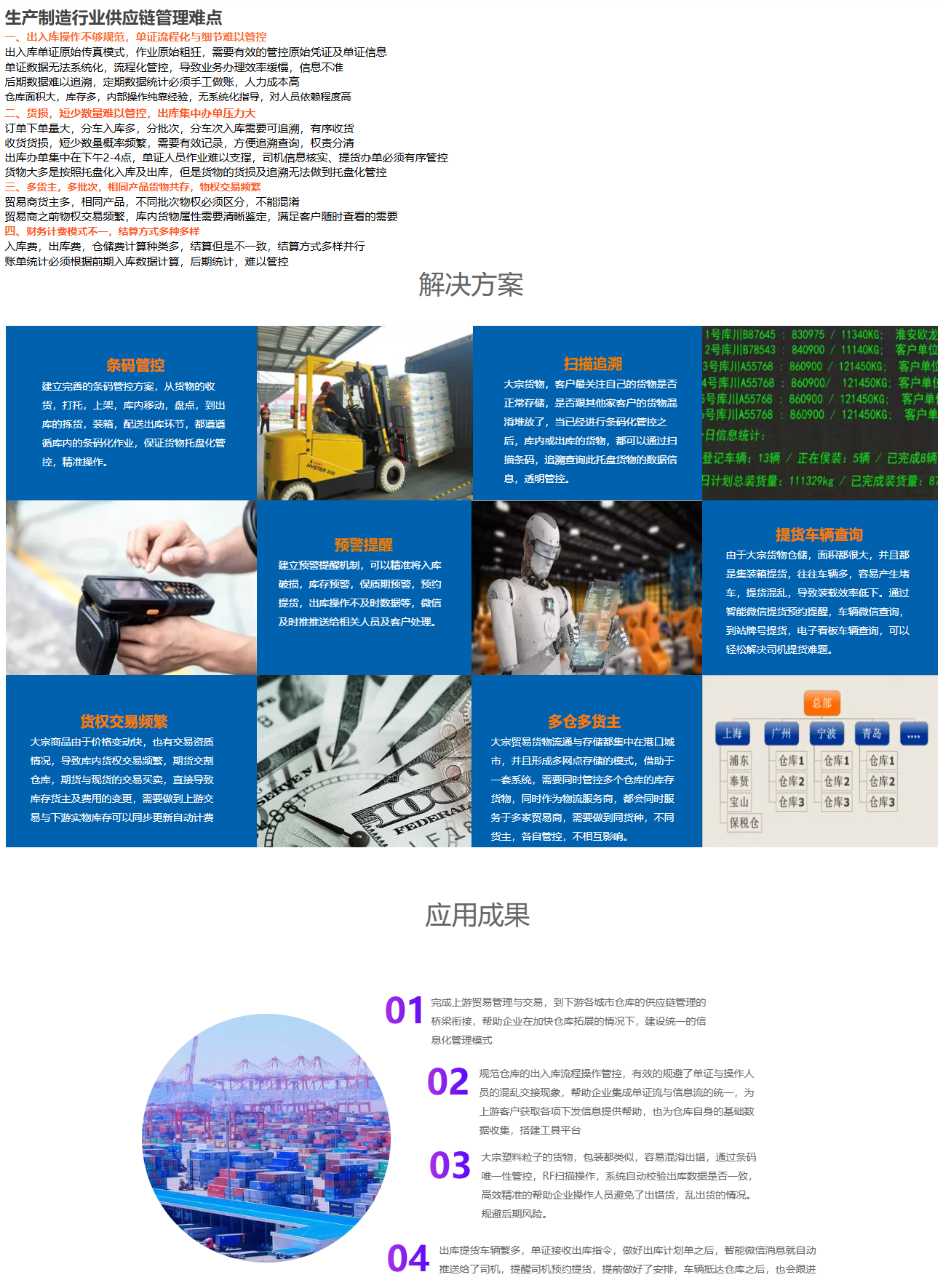 生产制造行业,是商业领域中最精细化管理的行业,往往要求各环节的生成加工都是最准确有效的流程,因此,作为制造行业的物流供应链,对制造企业,尤其是汽车生产制造主机厂的输送,就显得尤为重要,这个对物流企业的管理,服务质量,包括信息化水平,都是行业领先的!如果输送错误,导致组织错误或者是主机厂停线,造成的损失也是超级庞大的。 作为以信息化精准管控的SWMS仓储系统,针对生产型企业物流物料配送,组装零配件,半加工排序安装生产线,异步车型生产,都可以灵活适配。在出入库环节,可以做到严格的批次校验及波次分拣排序校验,有效的避免了物流企业在出库环节由于作业导致的风险损失