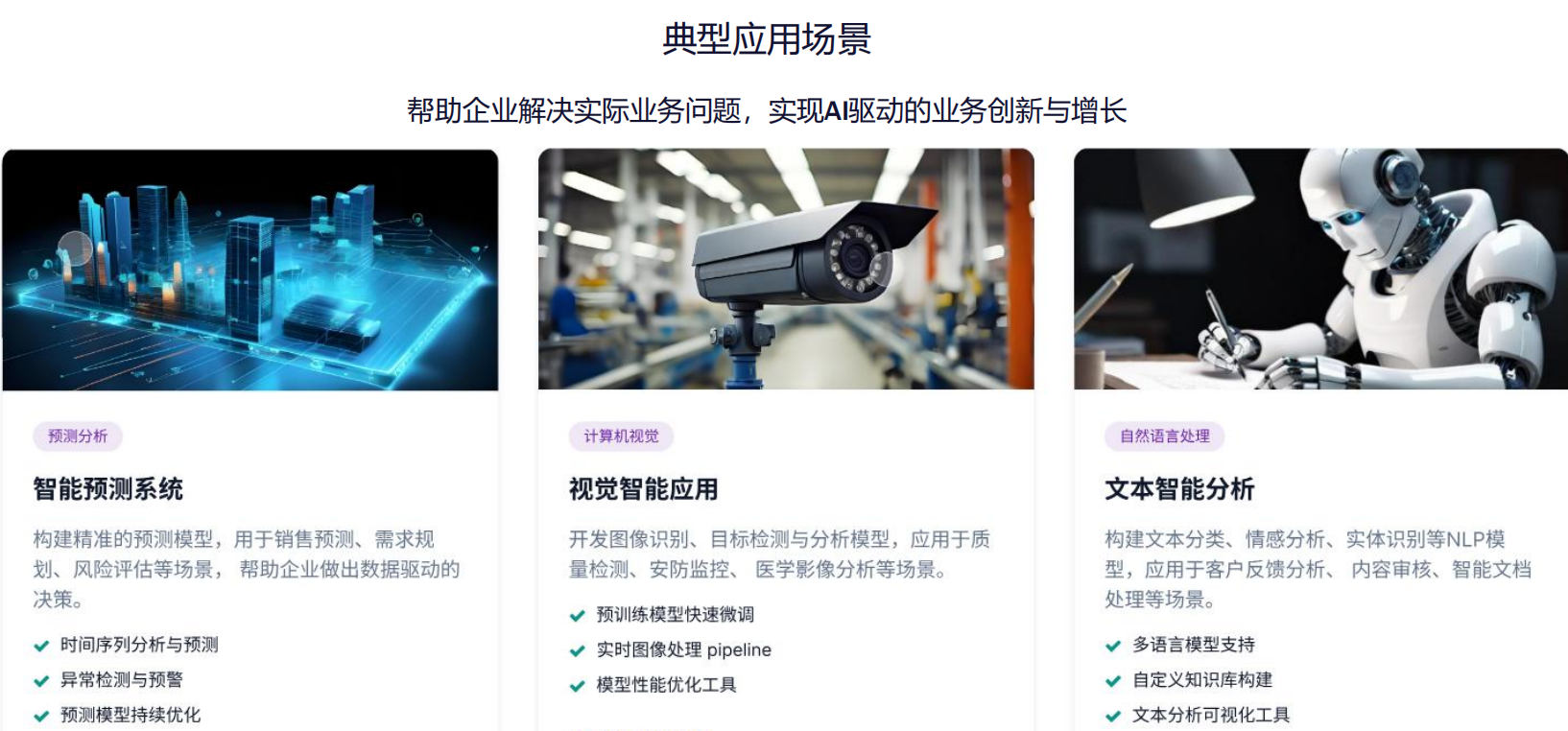 提供多种预置模型、计算框架,开源模型想用就用;零代码开发,简单操作训练出自己的模型;支持模型“一键训练、一键预测”