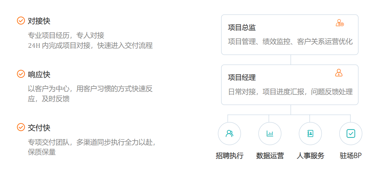 解决企业招聘难、人力成本高、用工风险大等核心问题,满足企业用工需求,帮助企业降本增效。