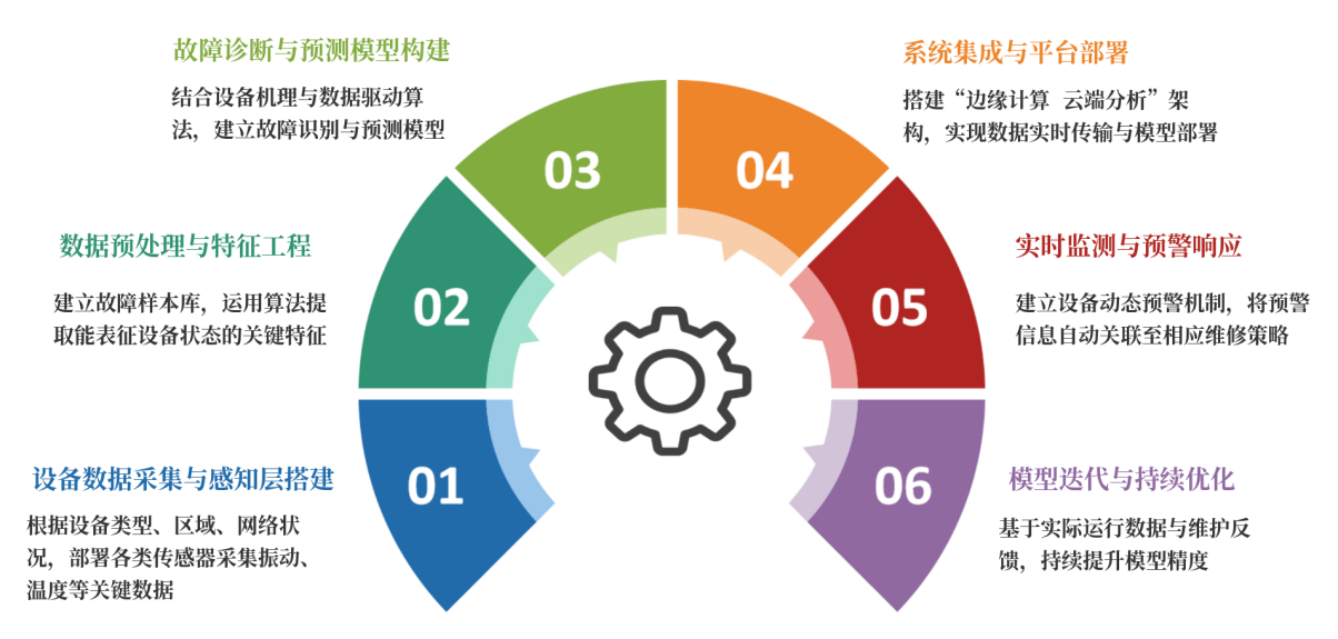 本次报告综合了6个案例的实施方案和过程,总结提炼了AI设备故障诊断与预测的通用性实施步骤,包括设备数据采集与感知层搭建、数据预处理与特征工程、故障诊断与预测模型构建、系统集成与平台部署、实时监测与预警响应、模型迭代与持续优化,为企业部署方案提供参考。