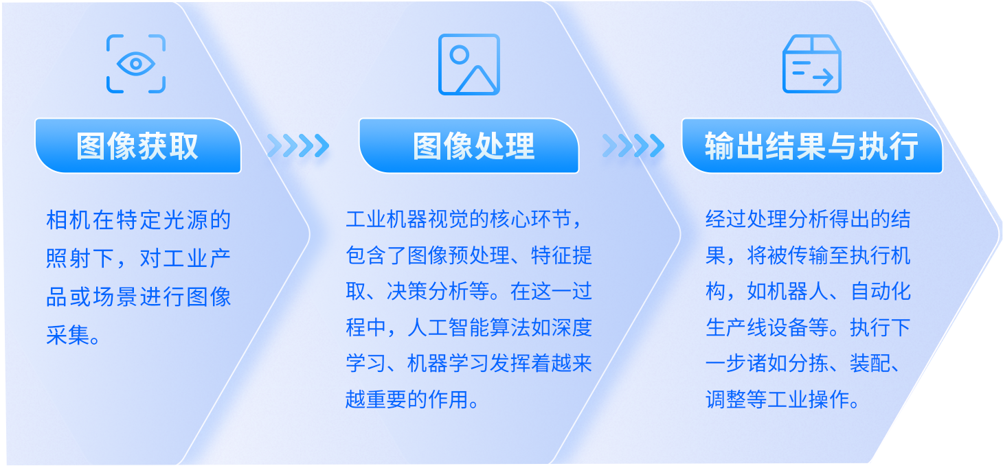 通过上述工作流程,可以清晰看到,一个典型的工业机器视觉系统通常由工业相机、镜头、光源、图像采集卡、外部执行设备等硬件组件,以及底层算法平台、应用开发软件等机器视觉软件构成。